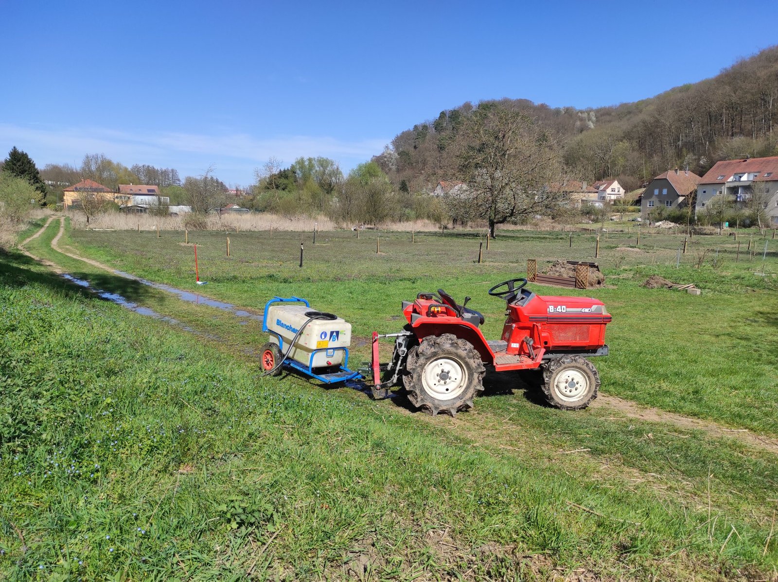 Après quelques jours de grosses chaleurs , premier arrosage avec un système récupérant l’eau de la rosselle grâce à une pompe .
